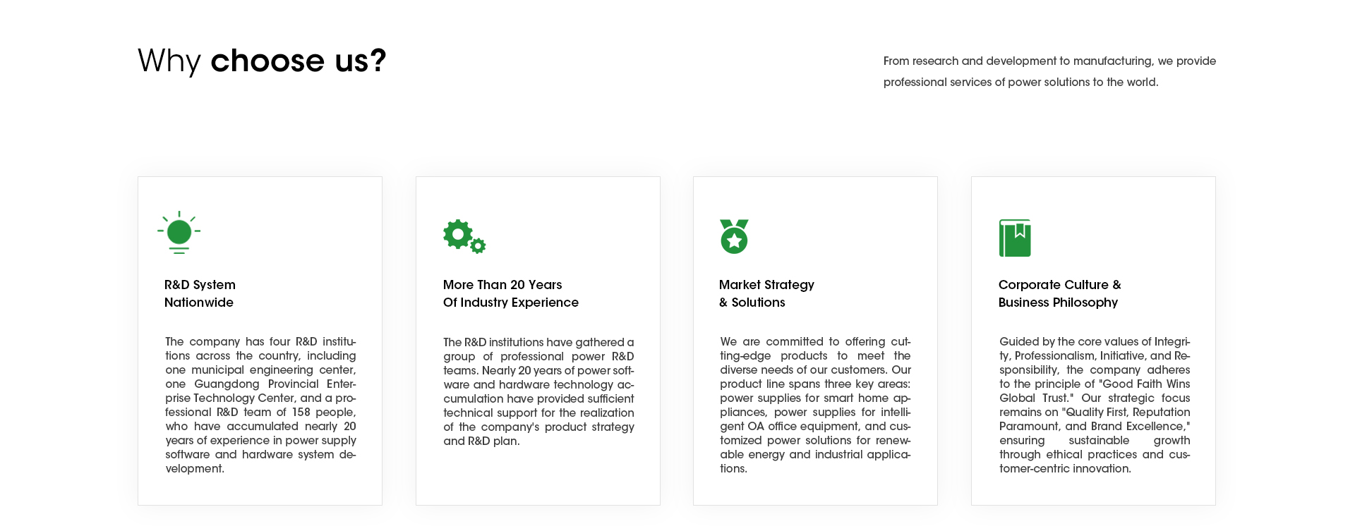 Our products encompass three major categories: power supplies for smart home appliances, power supplies for intelligent OA office equipment, and customized power supplies for renewable energy and industrial applications. These products are widely used in numerous industries such as LED TVs and displays, smart home appliances, small home appliances, intelligent OA office equipment, wind power, energy-efficient lighting, the internet, new energy vehicles, offshore vessels, medical care, and more.